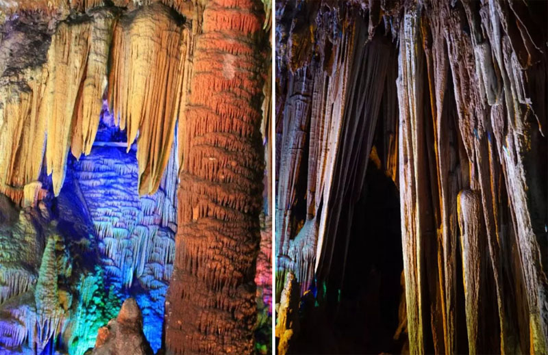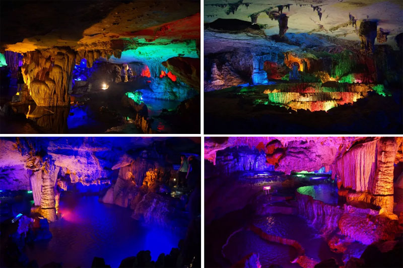 各种形态奇异,千奇百状的石群与七彩的灯光形映成趣,彷如进入一个奇幻森林,如入天马行空的梦境。